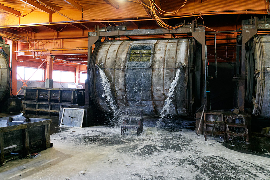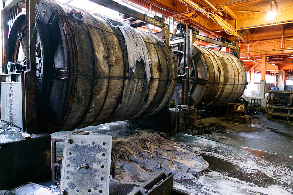 タンナー(製革所)にて。革職人の皆様と、皮を鞣す(なめす)『太鼓』と呼ばれる機械。