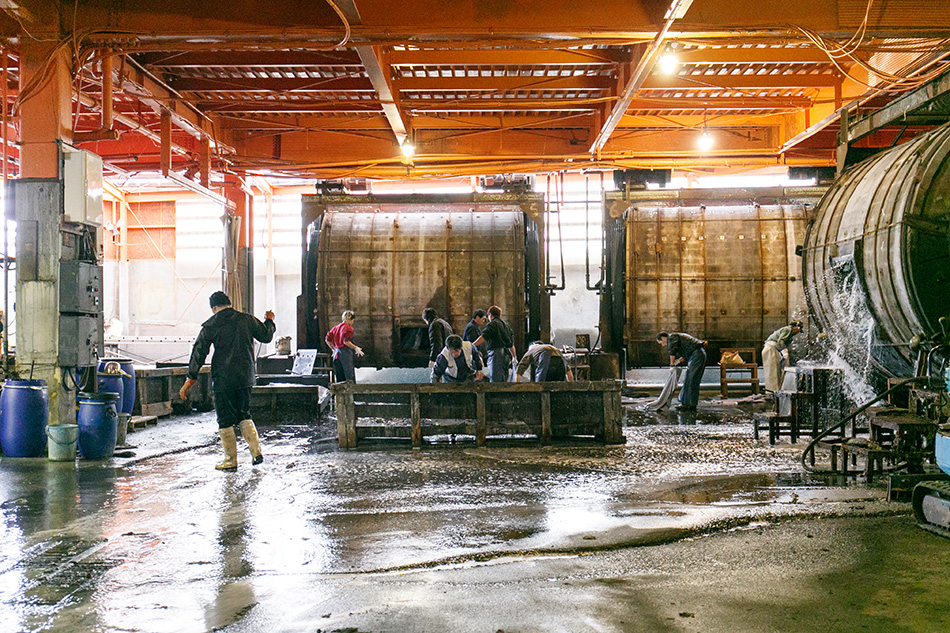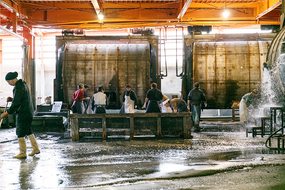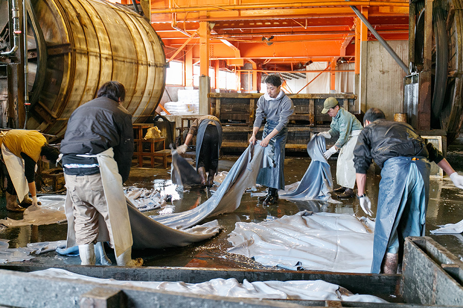 『太鼓』から取り出された革を積み上げる、革職人の皆様。