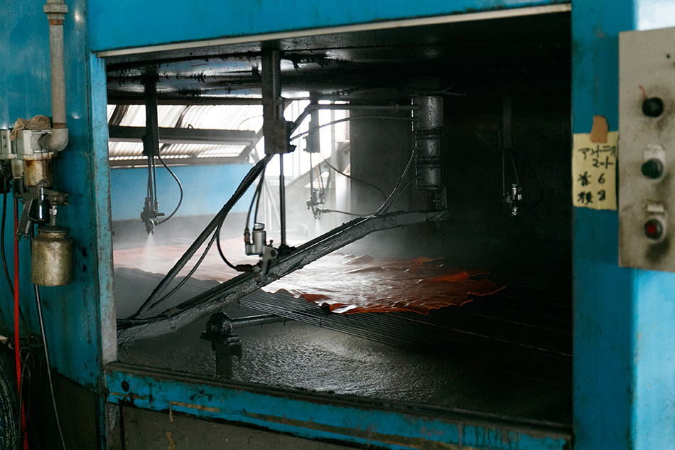 ブラックだと硬いから、(バタ振りを)長めの5分にしようとか。カーキは柔らかいから、短めの2分にしようとか。 1つ間違ったら全然違う革になってしまいます。