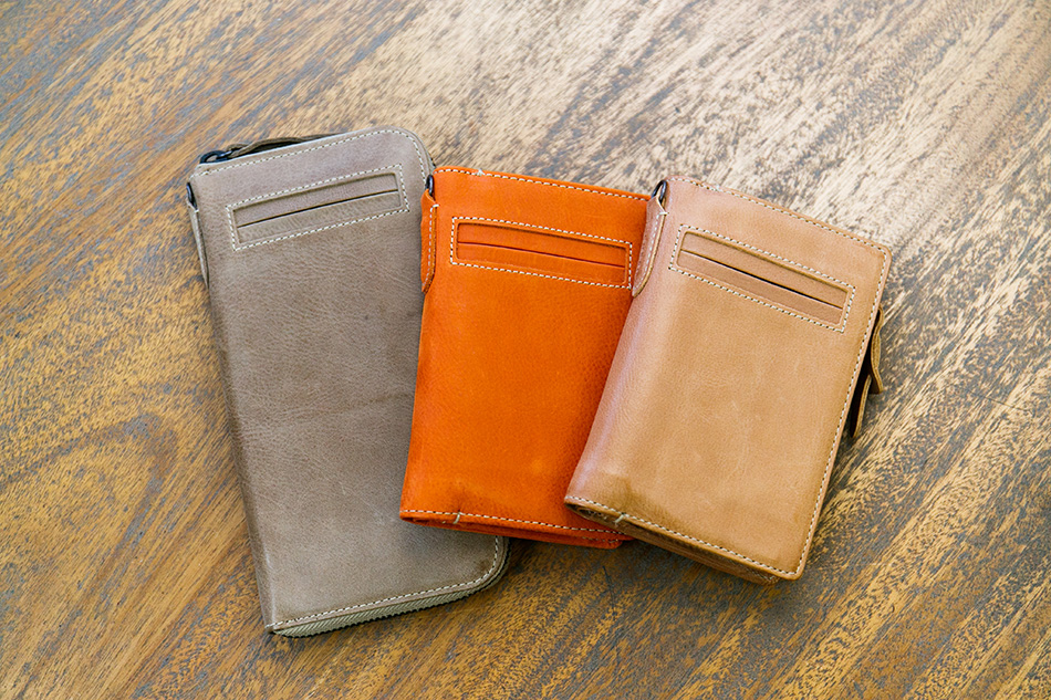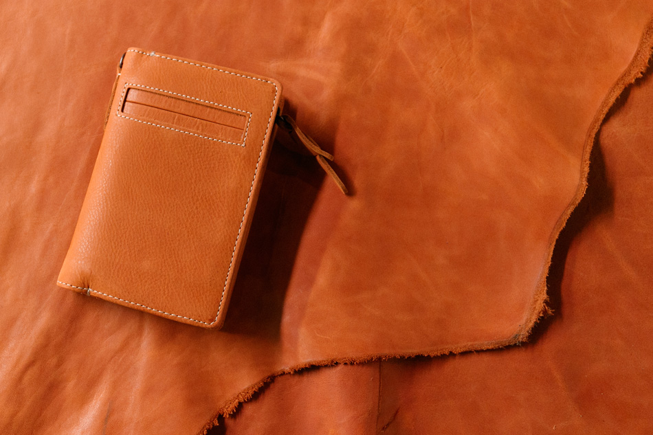 出来上がった、キュリオスの皮革のオレンジ色と、二つ折り財布 8LO-9933 。