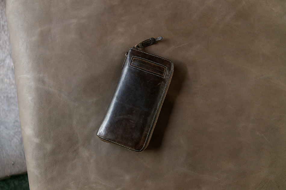 永く使い込まれた経年変化が美しい。山口様ご愛用の、キュリオスの長財布 8LO-9934 ダークブラウン色。